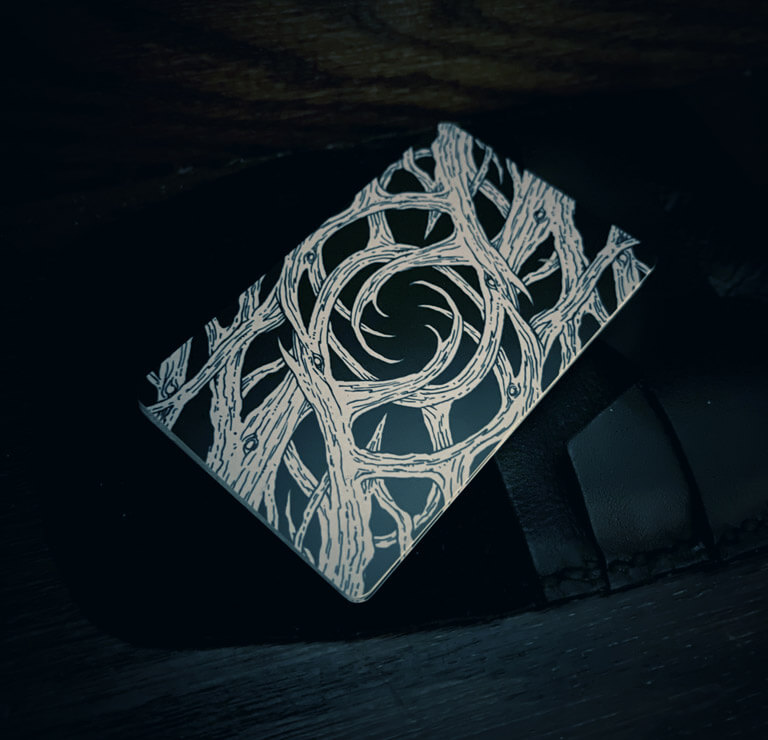 Instead of boring playing cards and patter about science experiments that modern audiences can’t relate to, the Druid ESP cards hook your audience with mystique and magic. The transformation from ho-hum to mysterious and memorable starts with twelve black plastic cards, each about the size and thickness of a credit card. The backs have what appear to be tree roots and branches on a black background. The cards are marked. The markings are so subtle that the spectator will never spot them, but you won’t have any trouble seeing them once you know what to look for.